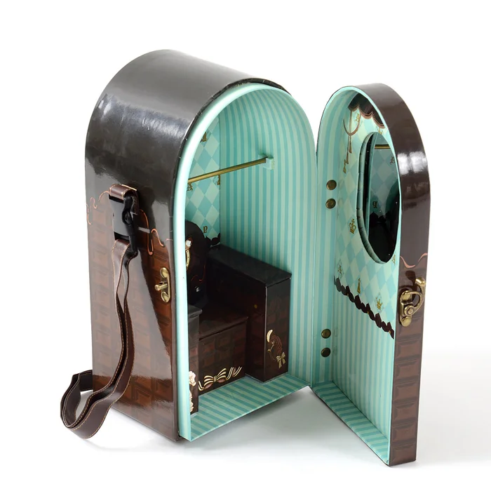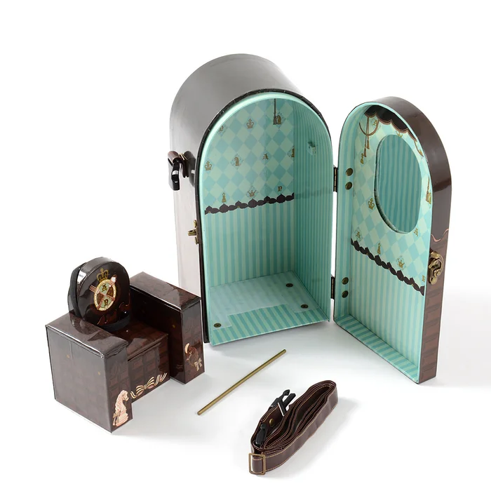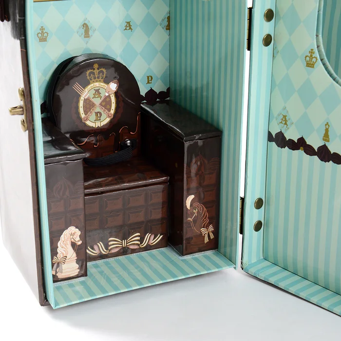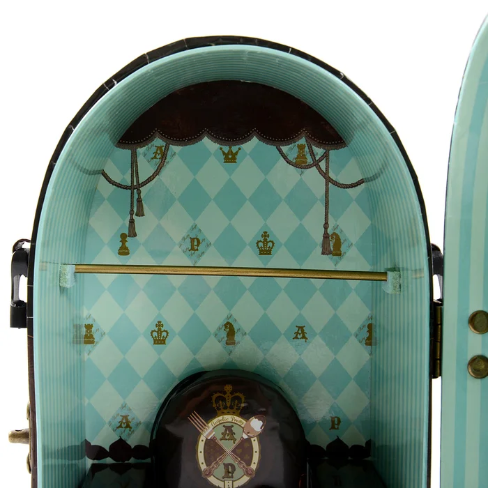 With a chocolate brown outside and mint green lining inside, the case comes with a removable throne-like chair so you can take her out to enjoy some tea and cake with you when you reach your destination.