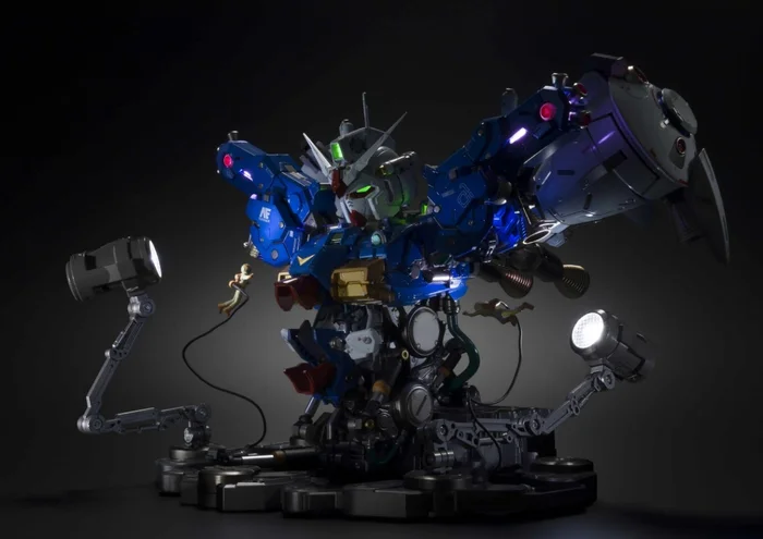 It features 16 internal LED lights that not only illuminate features such as the eyes and sensor units, but also spotlight internal details. The cockpit is fully portrayed for added realism. Hatches can be posed open to reveal mechanical features illuminated by changing multicolor LEDs (8 locations). The display is designed to evoke the appearance of the Full Burnern equipped “Zephyranthes” in the OVA series Mobile Suit Gundam 0083. Includes two arm-mounted LED searchlights, and three minifigures (one pilot, two maintenance staff).