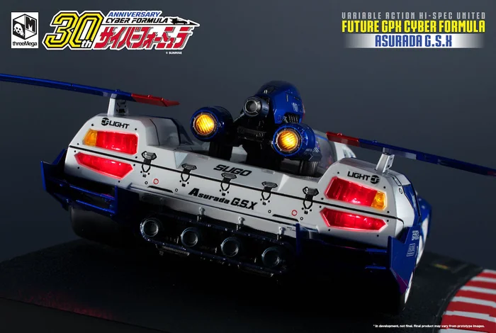 Put the petal to the metal with this revolutionary new collectible of the Asurada GSX from Future GPX Cyber Formula! As part of MegaHouse’s Variable Action Hi-Spec line, this vehicle figure possesses an absolutely stunning level of detail and features die-cast parts. It boasts real working headlights and afterburner visual effects thanks to built-in LEDs, while the race car’s doors, tires, and trunk can all move. And on top of that, an articulated and fully colored 1/18 scale Hayato Kazami figure can be placed in the driver’s seat! But that’s not all. The vehicle also comes with a base made to look like part of a race track!