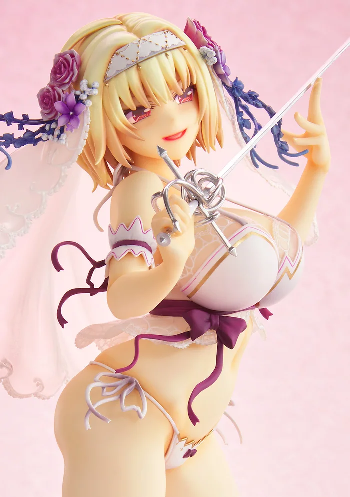 Vertex treats us to a luscious and thicc figure of Nora, Princess, and Stray Cat 2‘s Lucia of End! Sculpted by Fortunation, Lucia has been depicted in 1/7 scale, wearing one of her revealing outfits from the game. The erotic bride look has been masterfully replicated, boasting a flowing veil, a single thigh-high, and several purple and white bowties.